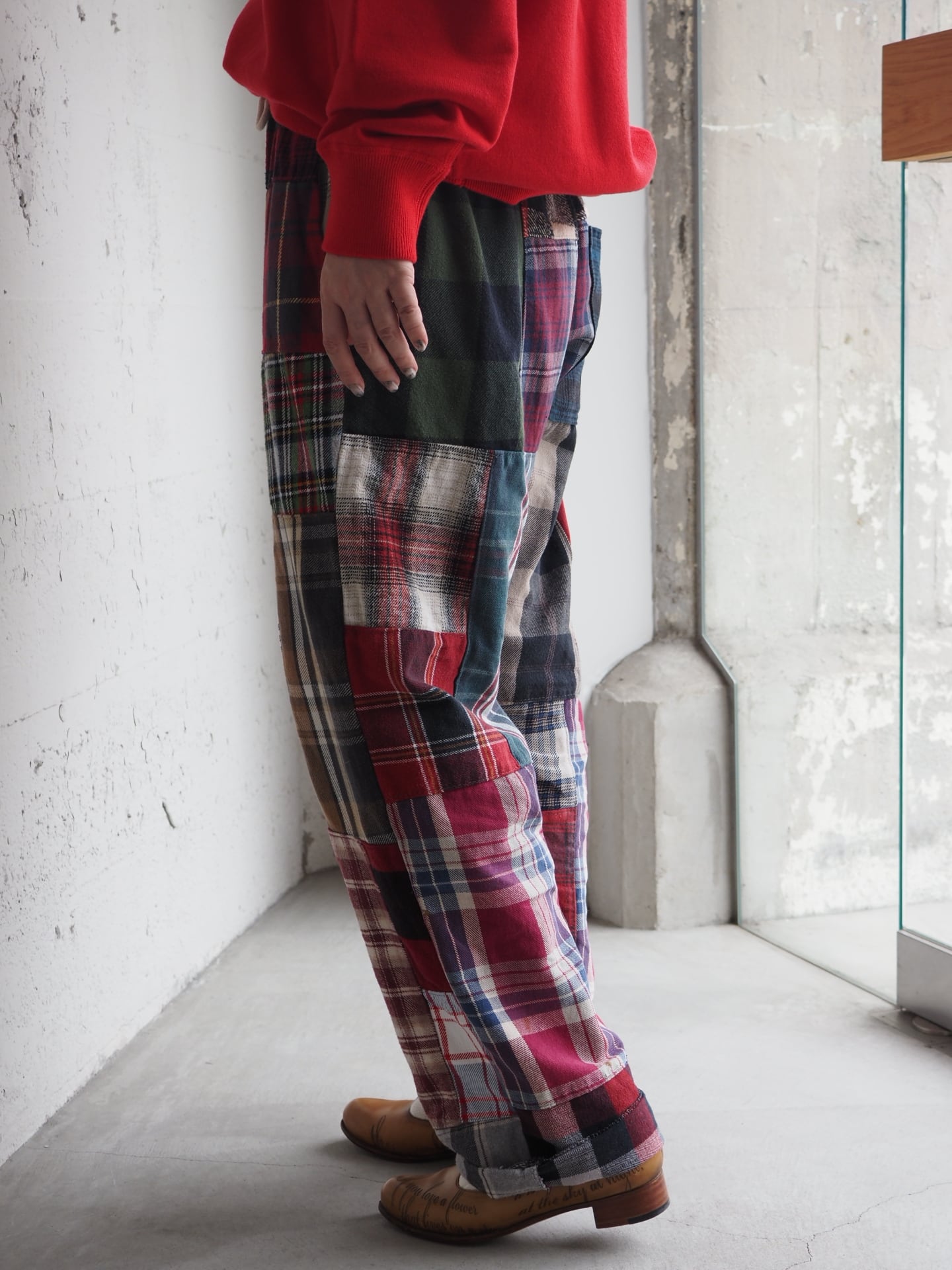 古着のフランネルの生地を組み合わせて作られた一点のものパンツをセレクトしています。