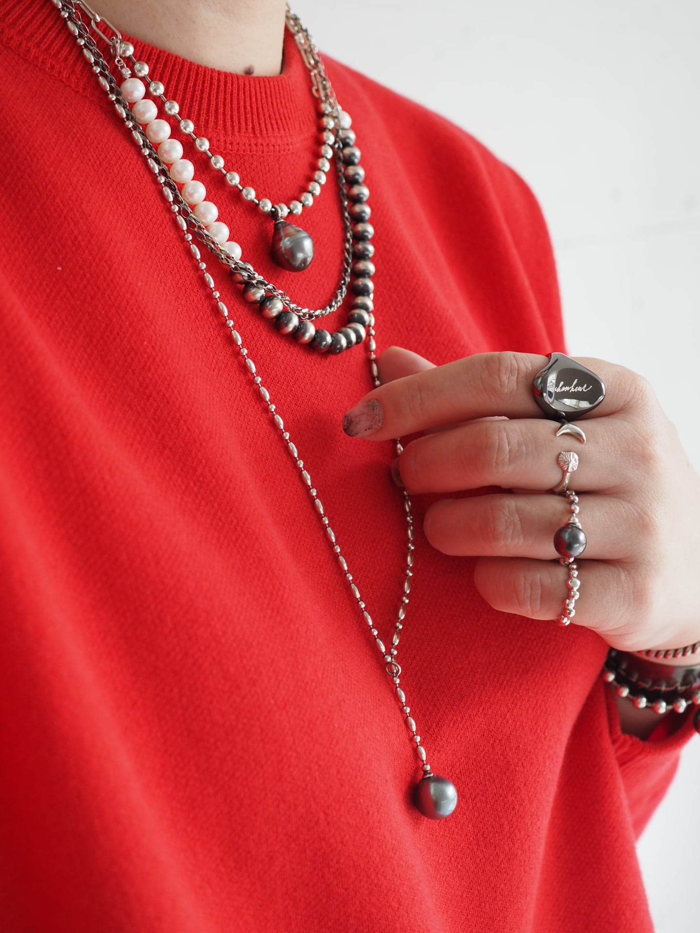 ジョイントのナバホパールやブラックリングやバングルなど、アクセサリーのブラックでアクセントにしたコーディネートに。