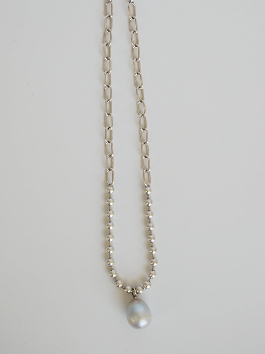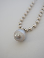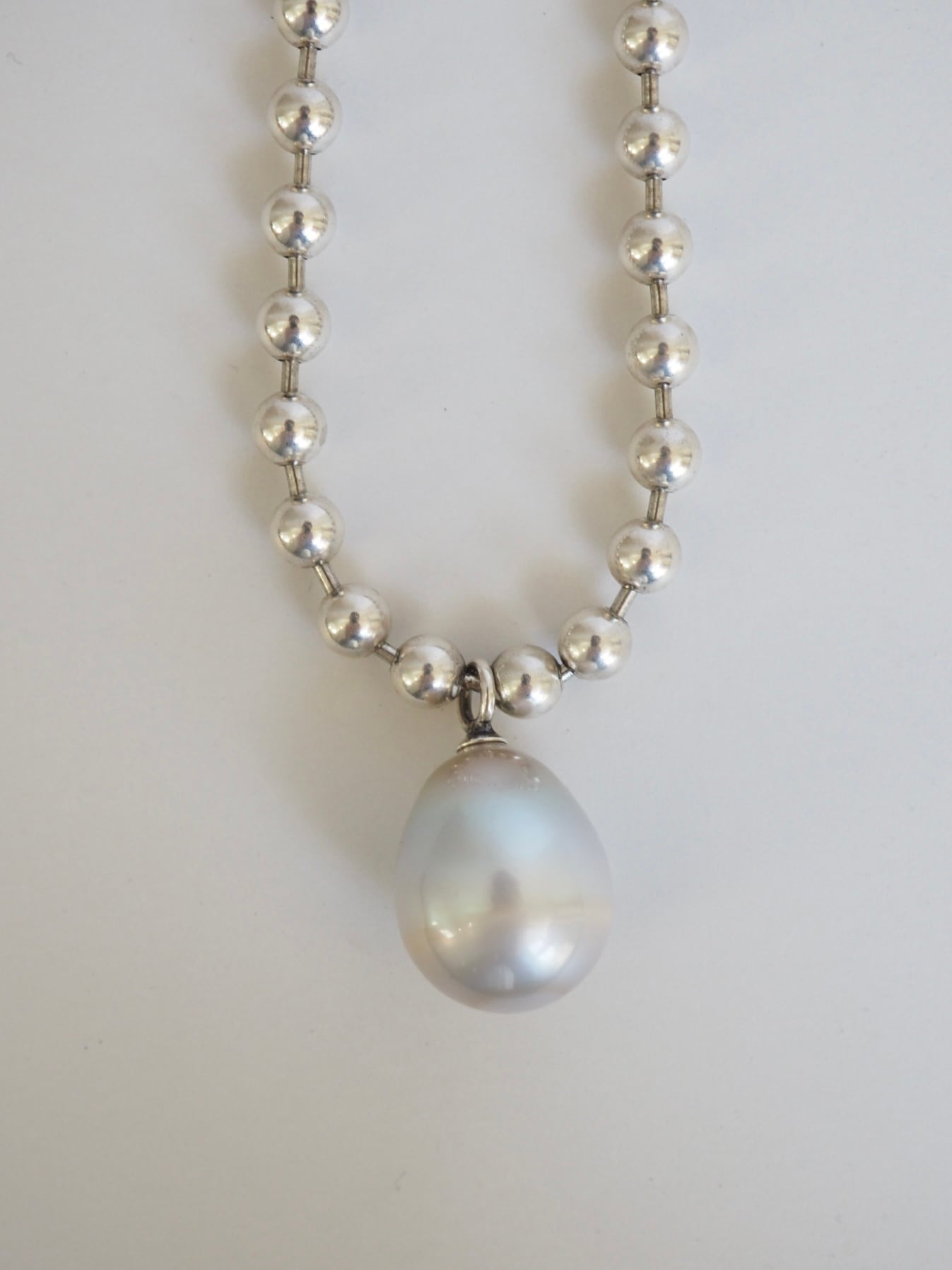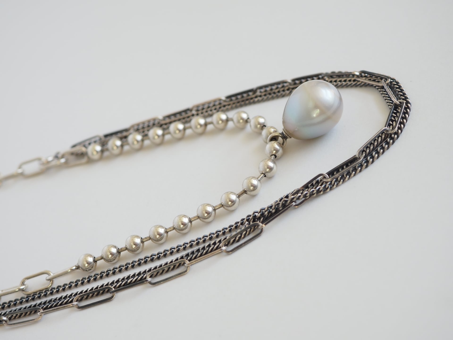 大胆な大粒のしずく型パールに相反するようなアンニュイなグレーのパール。