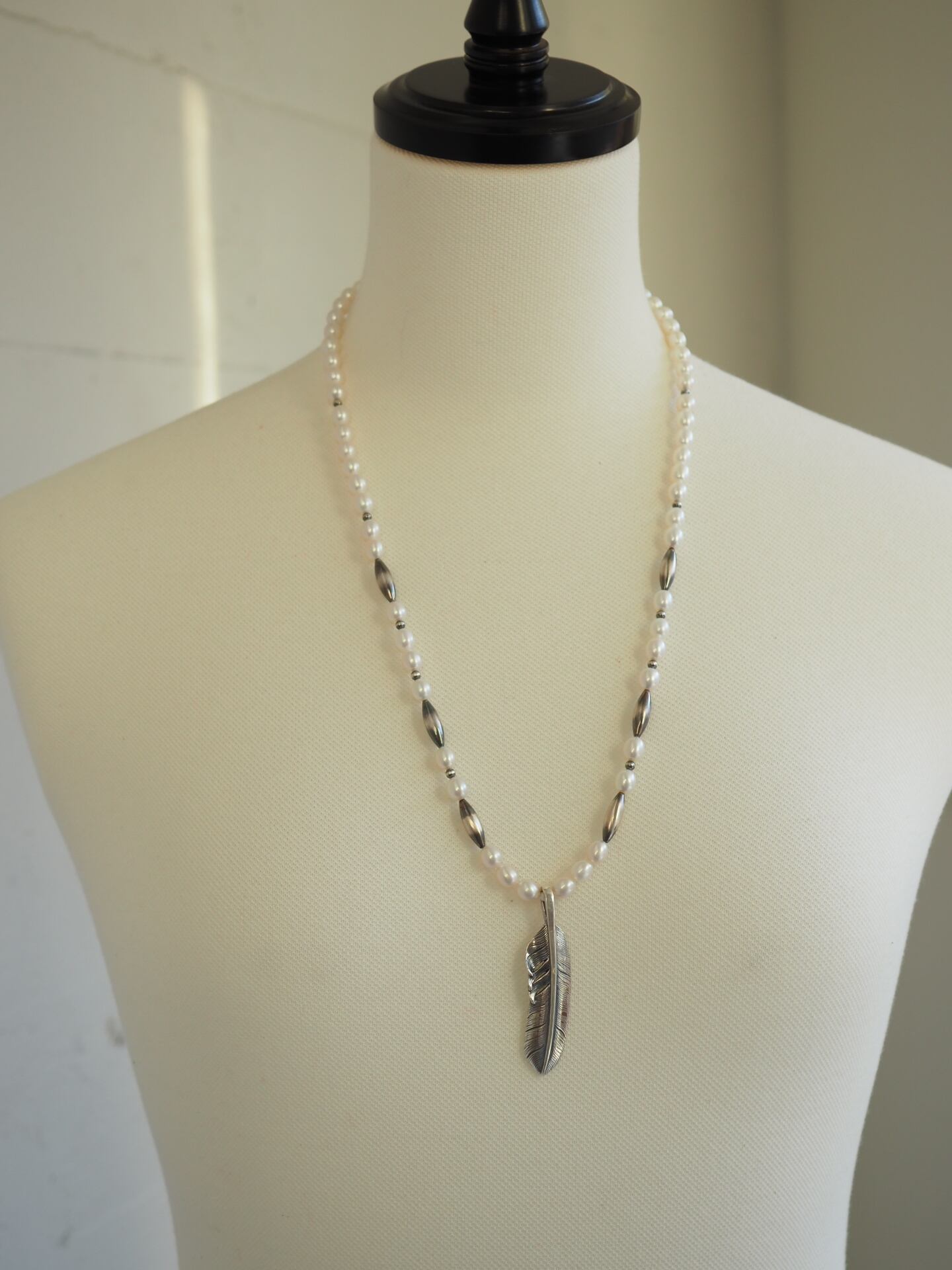 淡水真珠にナバホパールを合わせ、重厚感ある羽のトップを合わせた、