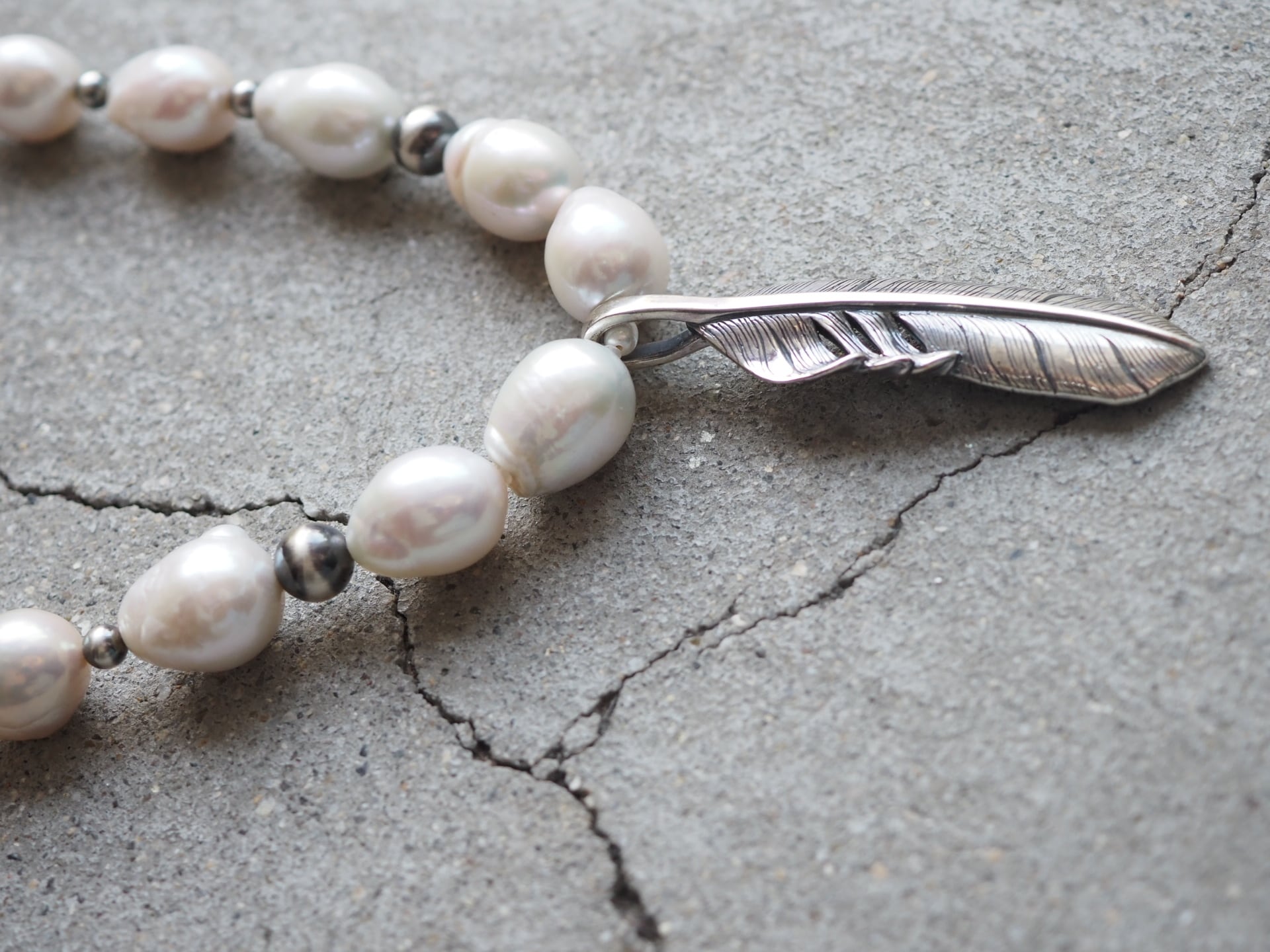 淡水真珠にナバホパールを合わせ、重厚感ある羽のトップを合わせた、