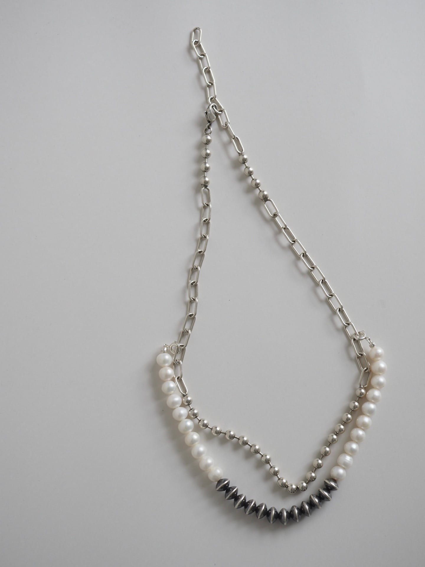 Ball chain mix necklaceには重ね付けでボリューム感を出すことができます。